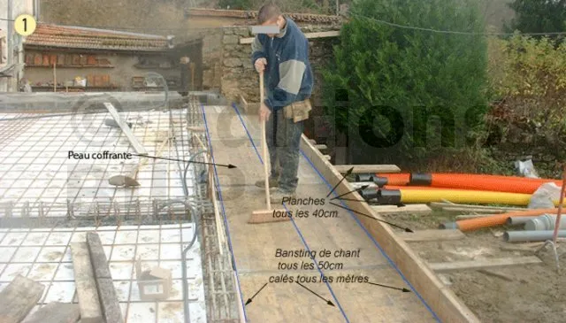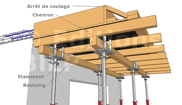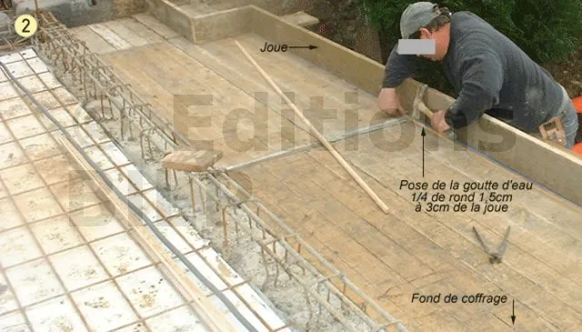 Les bastings devront être étayés tous les 50 cm et calés tous les mètres. Un platelage en planches ou en chevrons sera installé comme solives. Les arrêts de coulage (joues) seront alignés et positionnés à la bonne hauteur, solidement calés sur l’extérieur. Une goutte d’eau (larmier) sera fixé à 3 cm maximum du bord extérieur, clouée sur le fond du coffrage. Cette goutte d’eau évitera à l’eau de se placer sous le béton du balcon.