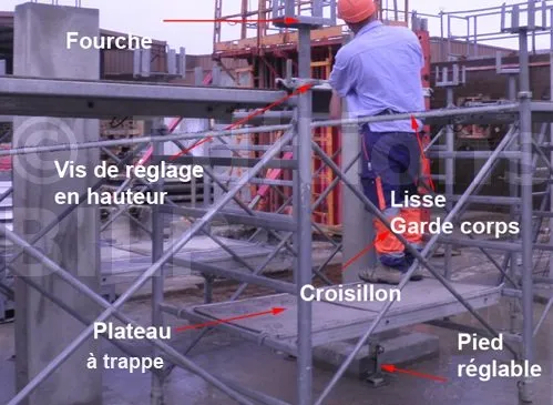 Les tours d’étaiement utilisées pour les ouvrages de bâtiment servent principalement de reprise de la descente des charges. Outre cette fonction fondamentale, les tours servent occasionnellement de postes de travail en hauteur. S’agissant d’un poste de travail en hauteur, celui-ci doit répondre aux exigences du décret 2004-924 du 1-er- septembre 2004 : il doit donc être équipé d’un plancher complet jointif, bordé de garde-corps avec lisse, de sous-lisse et de plinthe.