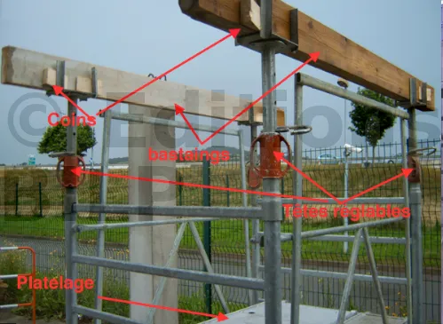 Il est constitué d’étais, de tours d’étai ou de tours échelles, sur lesquels reposent des poutrelles en bois ou en aluminium.