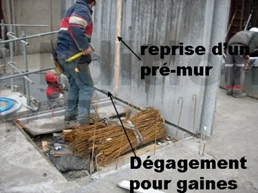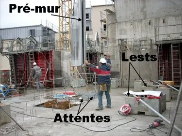 Le prémur est un élément en béton armé préfabriqué comportant deux faces bétonnées et un espace vide entre ces deux faces qui sera coulé sur le chantier.