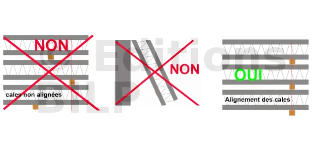 Stockage des palettes sur un sol plan, avec un calage au sol et les cales doivent toutes être alignées en superposition.