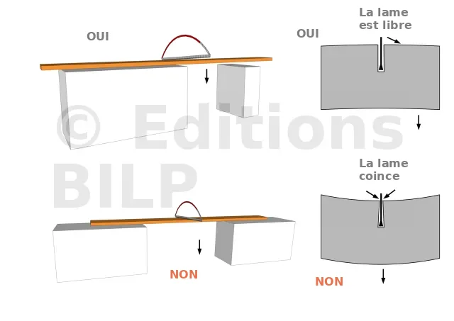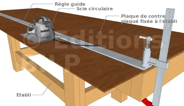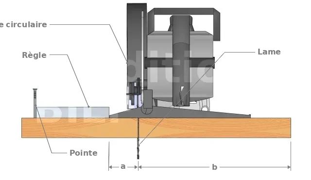 La règle se positionne à la distance voulue de coupe (b) + la distance entre le guide et la lame de la scie (a). Il nous suffira donc de pousser la scie contre la règle afin d’avoir une coupe parfaitement rectiligne.