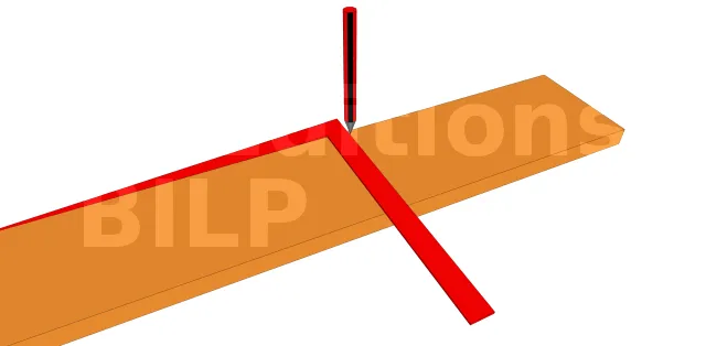 Positionner le grand côté de l’équerre le long de la planche légèrement en biais puis tracer le long du plus petit côté à l’aide du crayon de coffreur.