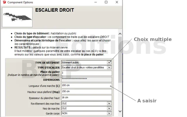 - Choisir dans la barre de défilement : le type de bâtiment, le type d’escalier ainsi que les autres caractéristiques de l’escalier et des marches.