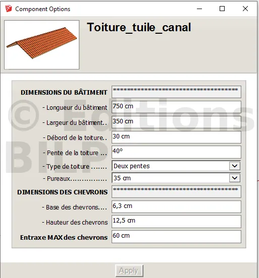 Pour modéliser votre toiture avec ce composant dynamique, vous devez connaître ses dimensions et son type.