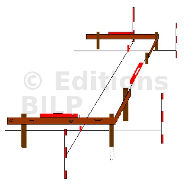 Placer un jalon dans chaque borne et tendre un cordeau entre ces jalons pour obtenir les alignements à l’aide des plans 1) de niveau et 2) de masse, placez des jalons aux angles de la future construction et rejoignez les par des cordeaux. C’est un jeu de parallèles et de perpendiculaires par rapport à ces alignements du terrain. Une fois que vous avez les angles de la construction :