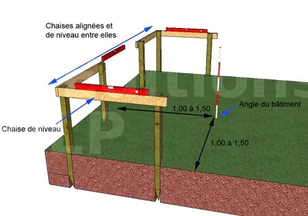 Les chaises doivent être très solides, indéformables et de niveau sur elles même et entre elles - Repérez d’une pointes plutôt les axes que les nus des murs de la construction sur les planches puis les relier avec des cordeaux.