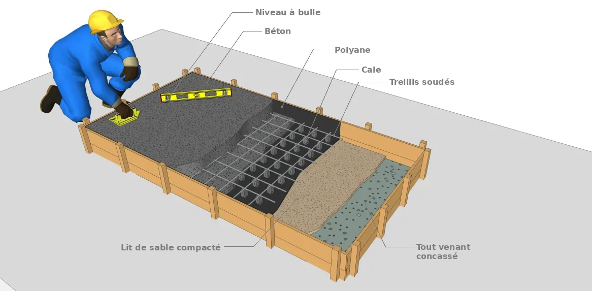 Cependant, si vous êtes déjà en possession d’une dalle, il sera inutile d’en créer une nouvelle. Il vous suffira de vous assurer de sa planéité et de sa solidité en vérifiant et réparant les fissures et les lézardes.