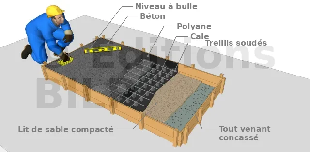 Cependant, si vous êtes déjà en possession d’une dalle, il sera inutile d’en créer une nouvelle. Il vous suffira de vous assurer de sa planéité et de sa solidité en vérifiant et réparant les fissures et les lézardes.