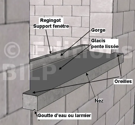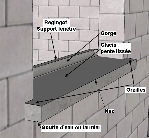 Pièce préfabriquée ou coulée en place destinée à supporter la traverse basse du dormant de la fenêtre.