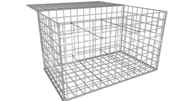 - Les cages à gabion consolident les pierres de carrière ou les galets. Elles sont constituées de panneaux grillagés ou de treillis soudé, de fil de fer galvanisé ou galfan qui peut être aussi enrobé de PVC ou de polyester, des spirales métalliques, des tirants de renfort en tige de fer galvanisé ou galfan, et des agrafes en acier ;