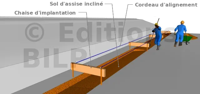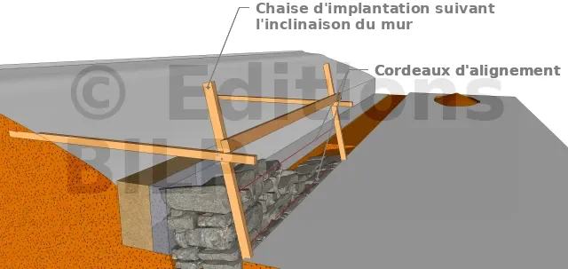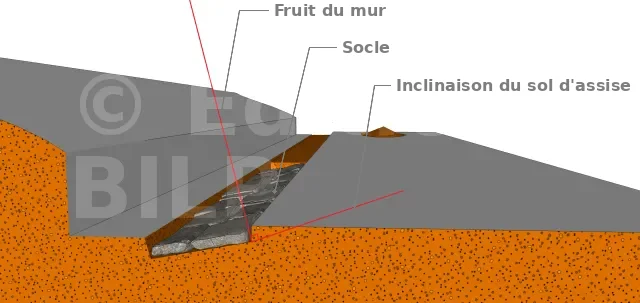 Le socle ou la première assise du mur doit suivre l’inclinaison du lit de pose afin de respecter le fruit du mur.