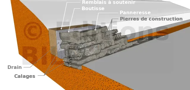 L’usage des murs en pierres sèches présente bien des avantages que des inconvénients : en effet, ils limitent la pression hydrostatique à l’arrière et assurent la stabilité de l’ouvrage en cas de forte pluie.