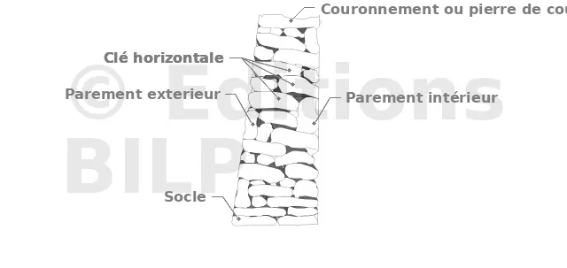 La stabilité du mur est assurée par la cohésion et le frottement entre les pierres, en effet, un appareillage parfait contribue à cette stabilisation. L’appareillage parfait consiste à placer successivement une boutisse et une panneresse dans le mur.