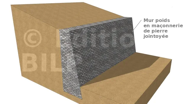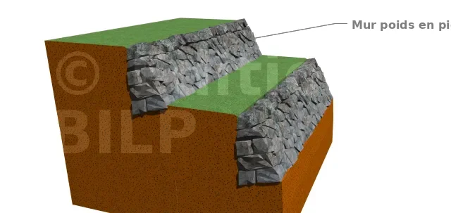 Les caractéristiques ainsi que la mise en œuvre des murs poids se différencient selon le type matériaux (béton armé ou non, pierres, briques, etc.)