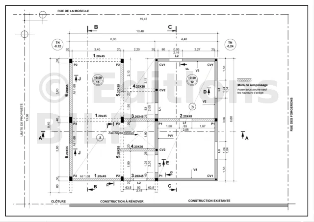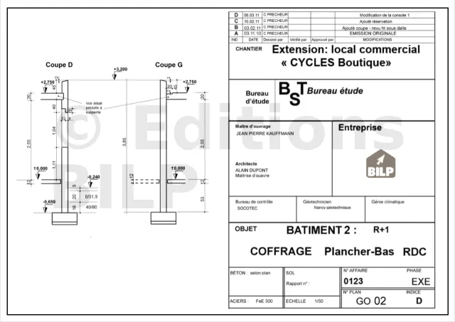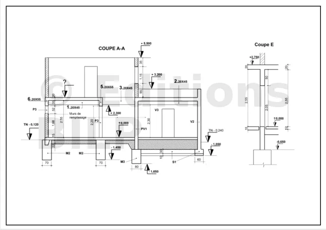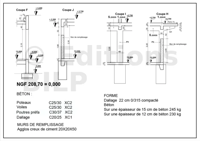 Les plans ci-dessus représentent un bâtiment R+1. Le dossier contient un plan de coffrage du plancher bas du Rez-de-Chaussée et des coupes.