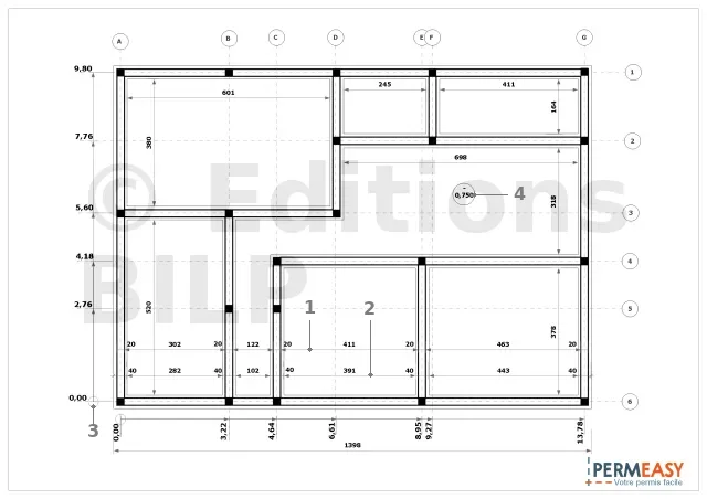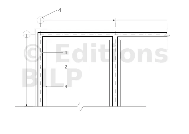 [1] La ligne de cotes cumulées avec un T renversé est utilisée pour indiquer l’emplacement des murs sur le terrain. Elle est tracée à partir de l’axe des murs et indique la distance à laquelle les murs doivent être construits par rapport à l’axe.