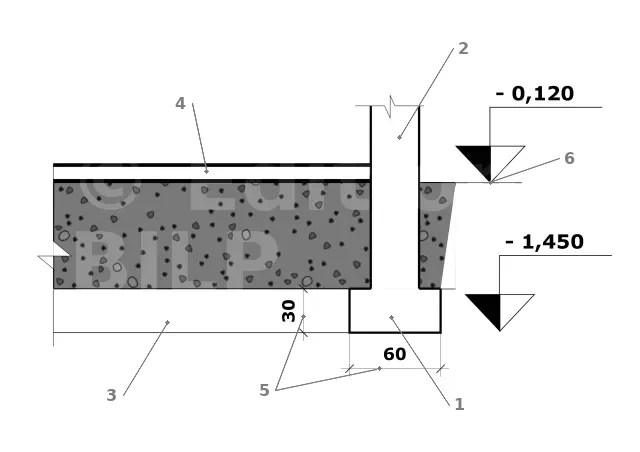 Pour les rigoles de fondation, une ligne de cotes brutes (2) spécifie les largeurs de fondation et les distances entre les rigoles. Les fondations sont généralement positionnées par rapport à l’axe des murs.