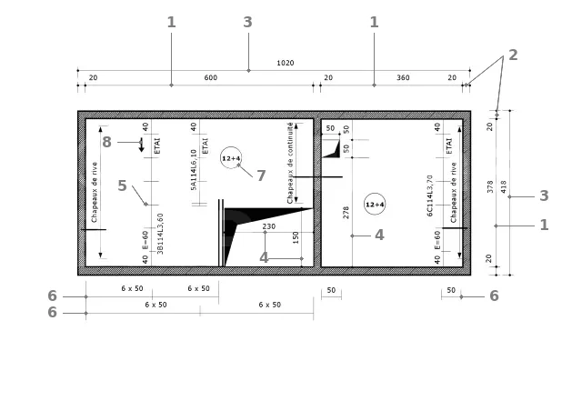 Le départ de l’axe de la première poutrelle se situe à 40 cm du nu de l’appui dans les zones A et C. Ainsi deux poutrelles encadrent la réservation de 50 x 50 cm du trou d’homme pour