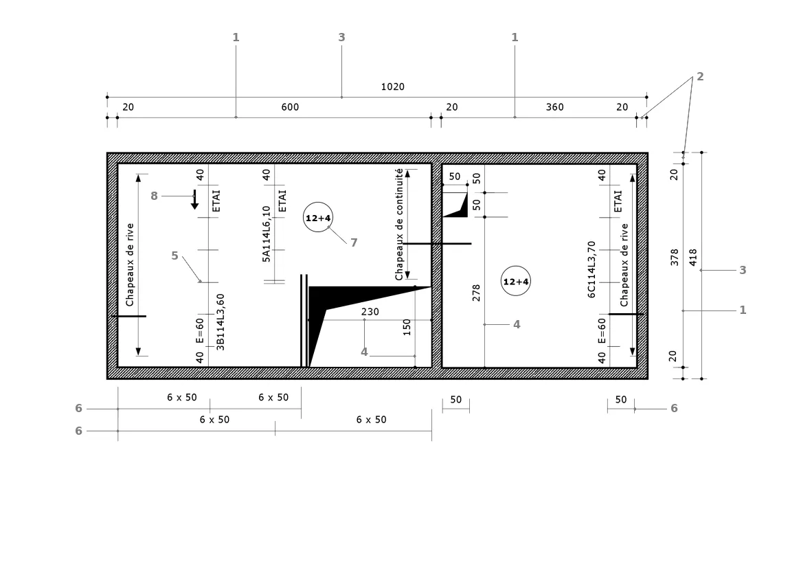 - Un plan de ferraillage qui indique en détails le positionnement des armatures dans le plancher préfabriqué, garantissant ainsi sa résistance.