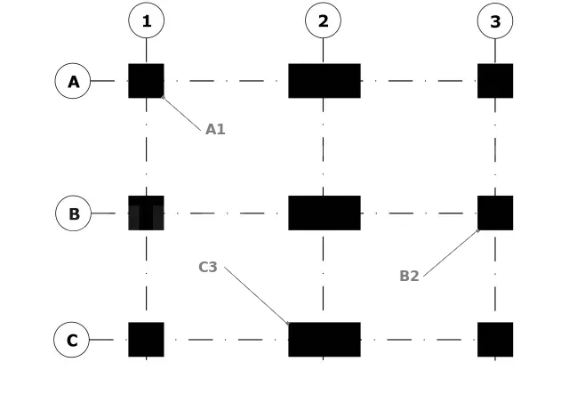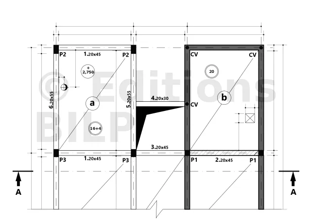 Les poteaux sont identifiés par une lettre majuscule P suivie d’un indice (P1, P2, etc.). Il convient de noter qu’un poteau conserve le même repérage sur toute la hauteur d’un bâtiment (par exemple, P2 du sous-sol jusqu’au 9ème étage). De plus, dans le cas d’une fondation sur semelle isolée, le même numéro est attribué à la semelle correspondante (par exemple, semelle S2).
