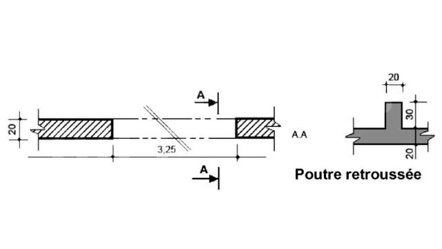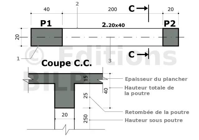 Le repérage des poutres se fait en utilisant un chiffre en trait fort qui représente le numéro d’ordre de l’ouvrage, suivi de la largeur et de la hauteur de la poutre (y compris l’épaisseur du plancher), exemple : 2(20x40) ou 2.20x40