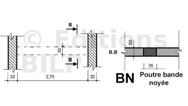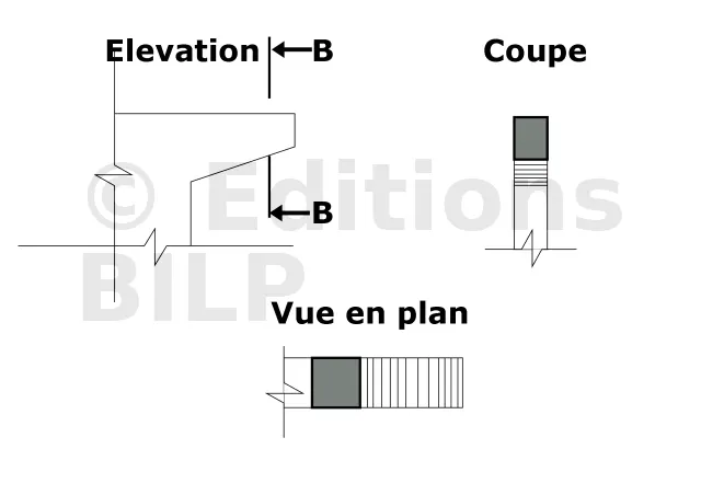 Sur les plans de coffrage, les poutres sont représentées par un contour en trait continu fort (2), et la portée ainsi que la largeur sont cotées. Cependant, afin de pouvoir indiquer la hauteur de la poutre et la hauteur de la retombée, une coupe verticale est nécessaire. La hauteur de la poutre comprend à la fois la hauteur de la retombée et la partie de la poutre située dans la dalle.