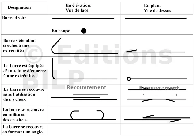 - En coupe transversale, une barre est représentée par un cercle noirci, idéalement proportionnel à son diamètre (dans un dessin à grande échelle).