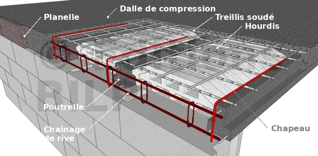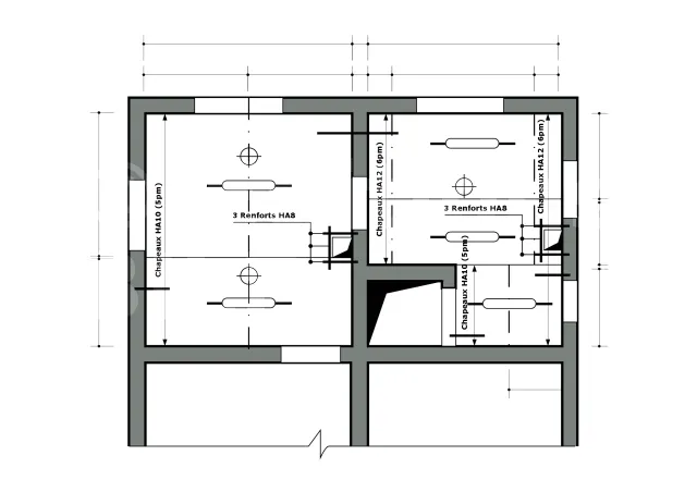 Dans le cas d’un plancher à poutrelles et hourdis, seules les armatures de la dalle de compression et les renforts pour les chevêtres et les trémies sont représentés sur les plans d’armatures. Leur représentation et leur repérage suivent les règles conventionnelles régissant ce type de plans. Les panneaux de treillis soudé sont rarement représentés, bien que leur quantité requise soit indiquée dans le document de synthèse (consultez l’article sur les plans de plancher). De plus, un ou deux chapeaux sont présents sur chaque poutre, permettant aux barres de pénétrer dans le chaînage de rive.