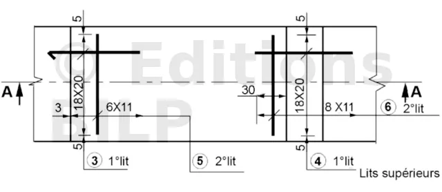 - La première option consiste à utiliser deux dessins distincts : l’un pour les lits d’armatures inférieures et l’autre pour les lits d’armatures supérieures. Dans ce cas, la technique de représentation des armatures répétitives est employée.