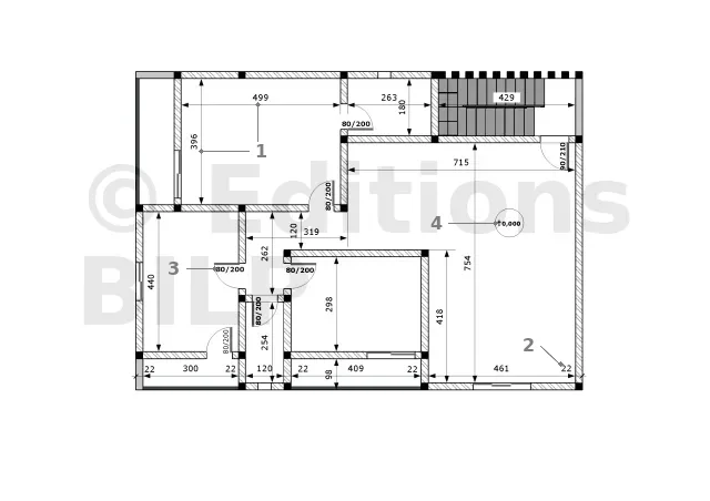 L’implantation des murs et des poteaux est généralement indiquée sur le plan de fondation par des cotes cumulées (3) à partir de l’origine d’implantation. L’origine est généralement l’un des angles du bâtiment, et deux lignes de cotes sur deux façades suffisent pour implanter l’ensemble du bâtiment.