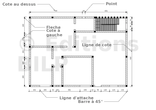 - Des points et/ou des flèches et/ou des barres à 45°, placés aux intersections de la ligne de cote et des lignes d’attache.