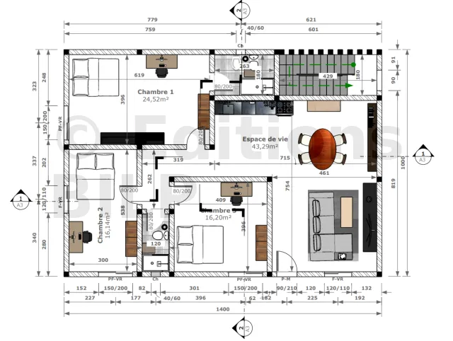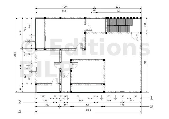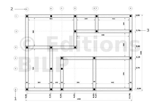 Les cotes d’implantation servent à positionner les axes des murs et sont représentées sur les plans par des axes verticaux numérotés (1) et des axes horizontaux lettrés (2).