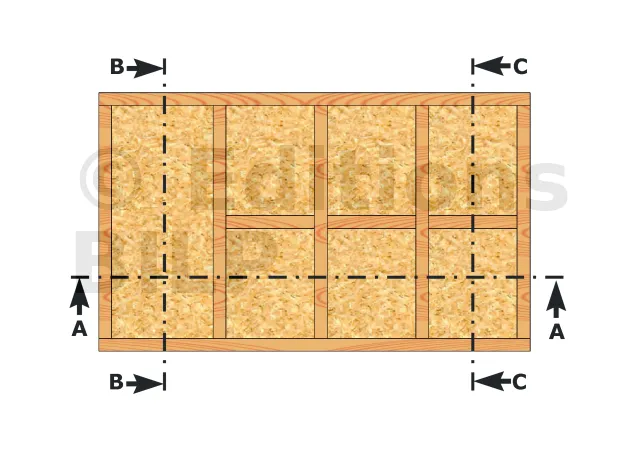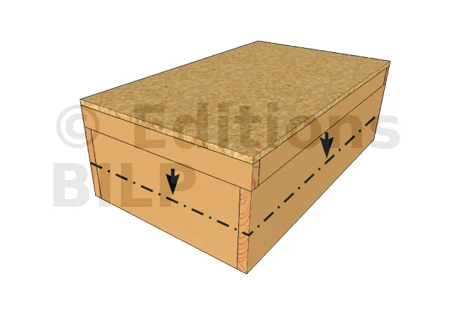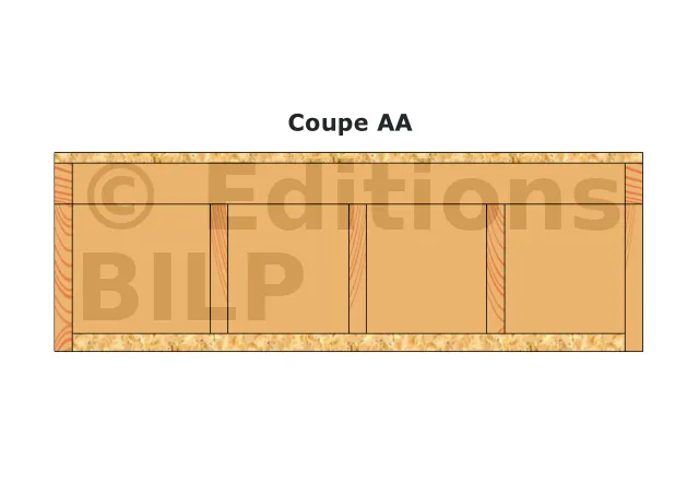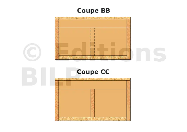 Avec une coupe horizontale, nous pouvons observer les détails relatifs aux épaisseurs, à la disposition des composants et aux cloisonnements de la caisse. Cependant, ces informations ne suffisent pas à elles seules pour réaliser complètement la caisse. Nous avons également besoin des détails concernant les hauteurs et les éléments spécifiques liés à la réalisation du couvercle.