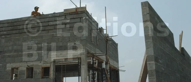 La passerelle d’accès est placée dans une fenêtre afin de pouvoir maçonner autant que possible. Elle sera enlevée au moment du coffrage du linteau. La maçonnerie est réalisée jusqu’à la hauteur de l’échafaudage. La hauteur intermédiaire est atteinte grâce à un hausse-pied composé d’agglos de béton et de plateaux d’échafaudage.