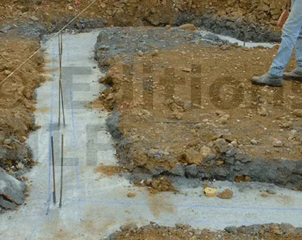Traçage sur les fondations à l’aide des cordeaux d’une ligne bleue et d’un plomb d’axe. Tendez fortement vos cordeaux entre les pointes qui définissent le mur (dans ce cas l’extérieur). Descendez le fil à plomb d’axe, du cordeau vers les extrémités du futur mur, jusqu’à quelques millimètres du béton puis tracez au crayon de maçon, reportez l’épaisseur de l’agglo en face (dans ce cas 20 cm). Tracez à la ligne bleue les deux faces du mur, car en posant le mortier, il se peut que ce trait soit effacé sur quelques cm. Les attentes des chaînages verticaux sont bien à l’intérieur des murs.