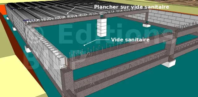 Un vide sanitaire n’est pas une forme de fondation, mais plutôt la surélévation de la dalle du rez-de-chaussée (une élévation d’au moins 60 cm est préférable), permettant l’accès pour d’éventuelles interventions sur les canalisations et les réseaux divers.