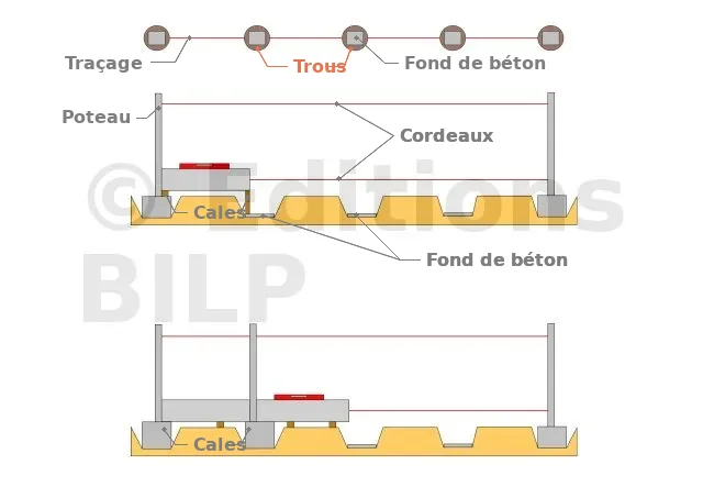 - Scellez le 1er au béton, calez bien le 5ème. Tendez un cordeau en haut à la même hauteur et un autre en bas pour aligner tous les poteaux.