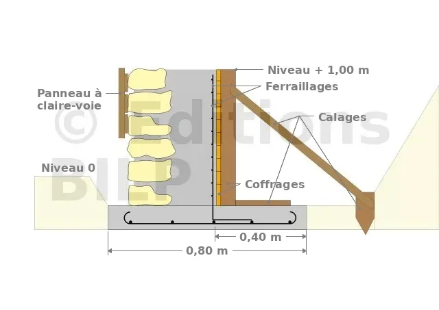 La semelle est importante ; elle doit être large pour servir de balancier, d’au moins 70 cm, voire idéalement 80 cm ou plus, et doit être ferraillé comme indiqué dans le schéma ci-dessus. Le ferraillage principal doit être positionné du côté de la terre à retenir. Vous pouvez même installer un drain de votre côté.