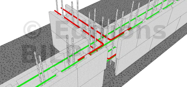 Une fois le rang posé, placez les ferraillages HA6 ou HA8 (armatures horizontales) et reliez-les avec des équerres aux angles du mur et au niveau des contreforts.