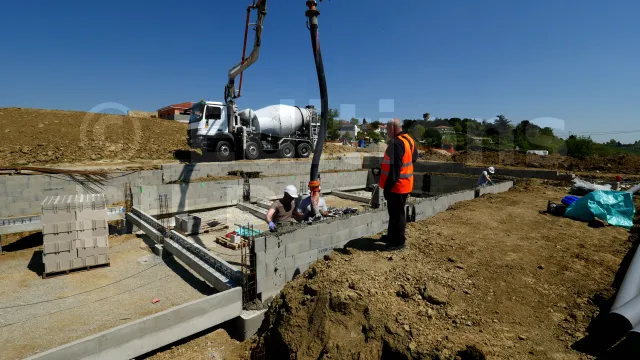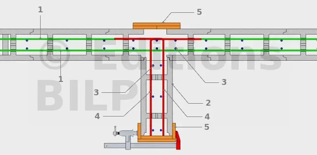 L’implantation du ferraillage de départ (attentes de fondation) et la planéité des semelles sont très importantes car ils conditionnent la bonne mise en place des premiers rangs (aplomb et alignement). Nous préconisons la pose du premier rang sur un lit de mortier afin d’avoir une base de mur plan et de niveau. Ce qui conditionnera un mur sans décalage en élévation. Il est très utile de prévoir des petites cales pour ces réglages. Le premier rang est le plus long à maçonner car il se peut que les ferrailles d’attente gênent le positionnement du bloc. Il suffira de se munir d’une griffe à ferrailler pour plier le fer vers l’intérieur des alvéoles. Le bloc à bancher se coupe également afin de croiser les agglos comme une maçonnerie classique.