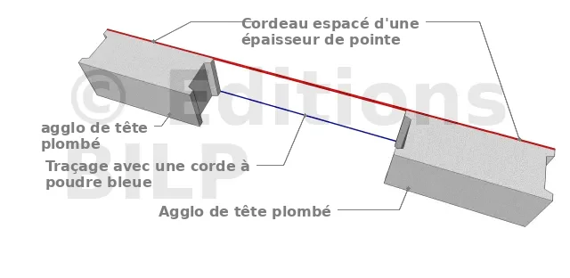 Le cordeau d’alignement se fixe et se tend entre les agglos de tête ou les agglos d’angle déjà plombés, en faisant quelques tours autour d’eux et en le plaçant à environ 5 mm du haut. Vous pouvez également ajouter une chute de bloc pour donner du poids à l’arrière des agglos (renard). Le cordeau nous fournira ainsi l’alignement et une horizontalité approximative.