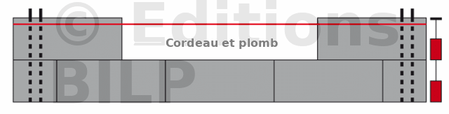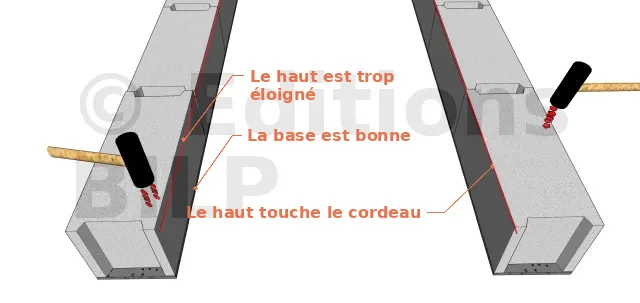 Lors de la pose des agglos intermédiaires, la base de ceux-ci doit correspondre parfaitement au trait bleu d’implantation ou au-dessus de l’agglo inférieur. Le réglage de la partie haute se fait par rapport au cordeau.