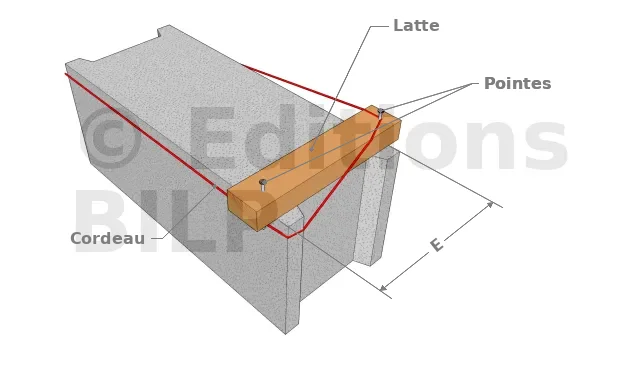 Nous pouvons également utiliser une latte avec deux pointes, espacées de la largeur d’agglo pour tendre les cordeaux.