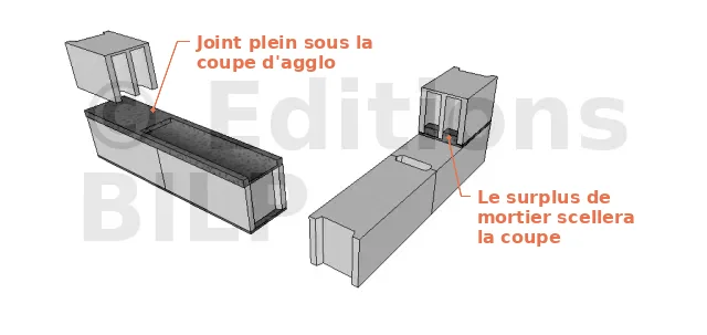 Dans le cas contraire, il sera très difficile de plomber, l’agglo ne descend plus, le mortier est trop tassé, les coups répétés de martelet fendront et casseront l’agglo.
