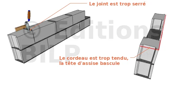 La base de l’agglo doit correspondre parfaitement au trait bleu ou à l’arête haute de l’agglo du rang inférieur. Pour cela, on vérifie avec l’arête de la taloche.