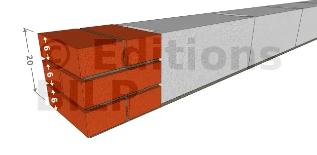 Un parpaing a une hauteur de 20 cm, tandis qu’une brique fait environ 6 cm. Donc, nous aurons besoin de 3 hauteurs de briques, plus 2 cm pour atteindre la hauteur du parpaing. Nous allons diviser ces 2 cm par deux pour obtenir deux joints de 1 cm chacun. Ainsi, la pile de 22 x 22 sera à la même hauteur que les parpaings.