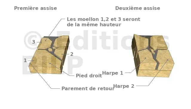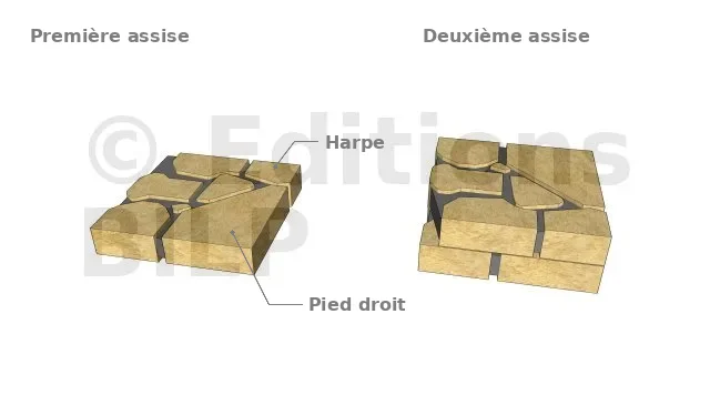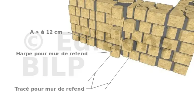 Il consiste à lancer des harpes en bascule dès la première assise, puis une assise sur deux en direction du refend. Pour faciliter la liaison, il faut maçonner une harpe à droite et une à gauche en alternance. Ces harpes doivent pénétrer dans le mur plein sur les 2/3 de sa longueur. Il faudra absolument aligner les parements de ces moellons et les redresser selon le tracé du refend. On choisira donc les harpes parmi les plus longs moellons.