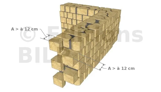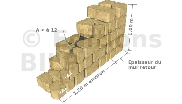 Il s’agit de réaliser des assises en gradins faciles à relier ensuite au mur plein. La longueur des amorces déharpées varie en fonction de celle des moellons utilisés. La pente du dégradé est d’environ 45° pour la pierre courante et réduite à 1/2 si l’on utilise des moellons très plats.