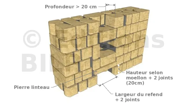 On réserve des arrachements dans le plein mur d’enceinte. Cela consiste à créer des vides, une assise sur deux, à l’emplacement du départ du mur de refend. Ces espaces, d’une profondeur de 20 cm, auront la largeur du mur à raccorder, si l’on dispose de pierres suffisamment longues pour les utiliser comme linteaux. Si le refend est prévu en briques ou en agglos, la hauteur devra correspondre à leurs dimensions plus 2 cm pour les joints. Cette technique ne donne pas de très bons résultats lors du raccordement, pour les mêmes raisons évoquées dans le chapitre (bourrage des joints).